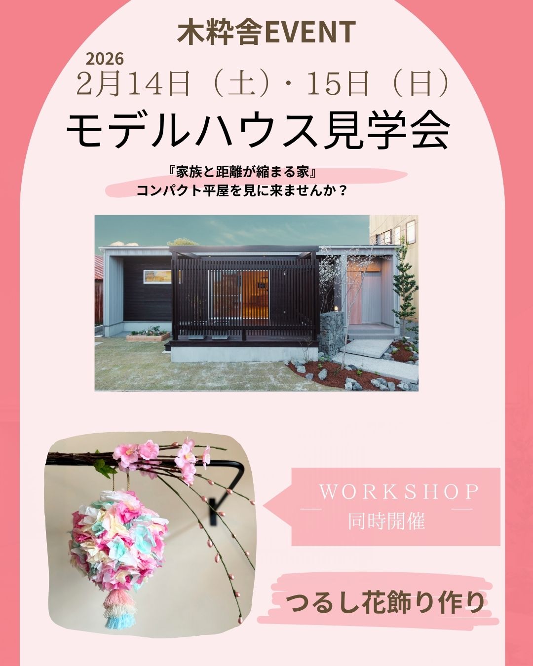 2026年 2/14(土)-15(日)【コンパクト平屋】モデルハウス見学会(キッチン&ガーデン編) 2026.02.05 <コンパクト平屋モデルハウス見学会>①10:00~12:00 (ワークショップは10:00~11:00)②13:00~15:00 (ワークショップは13:00~14:00) 江戸時代創業 材半/木粋舎による【ナチュラル志向】の家づくり木粋舎GARDEN plus+シリーズ「家事楽オーダーキッチン&ガーデンリビングのある暮らし」 皆様の声から誕生しました。 「視線を気にせずアウトドアリビングを楽しみたい!」 「料理が楽しくなる私だけのこだわりキッチンが欲しい!」 そして何より、「小さくてじゅうぶん!」 【小さくて十分】 住宅の性能が向上し、以前に比べ、格段に快適に過ごせる家が増えました。今や高性能は当たり前。しかし一方で、価格高騰により理想の家が買えなくなる人が増えてきました。今さら、性能は落としたくない。でも高性能住宅は高い。そんな中、「もう小さい家でじゅうぶん。」という声が増えてきました。 部屋数が足りないのは困るけど、部屋が小さいのは我慢できる。家族だけの家だから、廊下がなくてリビングから各部屋に直通でも問題ない。でも収納は欲しい。部屋を小さくすれば、その分収納スペースを確保することもできます。モノをためない買い替えスタイルの方は、荷物半減でよりコンパクトに。 24坪3LDK。子供2人の4人家族なら、贅沢を言わなければじゅうぶん住めます。ご夫婦2人暮らしなら18坪2LDK~。さらにコンパクトなシングルライフプランもあります。 【一点こだわり主義/素材編】 安ければいいというものでもありません。一つ自慢のポイントがあるだけで、我が家への愛着が格段に増します。心地よさを求めるなら、素材にも気を配りたいものです。内装は健康や環境に配慮した自然素材。床は無垢材。壁は漆喰塗り。天井まで板張りにすることもできます。 想像してみてください。木の香りのする家を。 【一点こだわり主義/キッチン編】 こだわりたいのは素材だけではありません。 家づくりでこだわりたいポイントランキングで、常に上位をキープしているキッチン。家にいる時間が一番長い主婦にとって、キッチンは特別な空間なのです。 キッチンにはこだわりたい。それなのに、対面式か背面式かを選ぶだけ?アイランド型?あるいはペニンシュラ型?天板をステンレスか人工大理石かを選ぶだけ?パネルの柄を選ぶだけ? 実はキッチンもオーダーメイドできるのです。 「料理は好きだけど、洗い物は嫌い!」 「家族で一緒に料理を楽しみたいのに、作業台が狭過ぎ!」 「もっと明るくて快適な空間で料理を楽しみたい!」 コロナ禍で、家族が家で過ごす時間が長くなりました。子供たちが、「お母さん、私も料理手伝うよ。」と。でもキッチンの作業スペースは幅60cmしかありません。「ありがとう。でも、あっちで遊んでいてね。」残念ながら、そんな会話が当たり前のようにされているのです。 量産メーカーのシステムキッチンは、誰もが便利に使えるように考えられ、また、生産効率を高めることでコストも抑えられています。コンロ、作業スペース、シンクが一列に並べられ、幅2550mmに効率良く収められています。とても良くできた商品ですが、一方で、生活スタイルの変化には対応できないことが多いようです。 ご夫婦2人で料理を楽しみたい。子供たちと役割分担しながら料理を覚えさせたい。アウトドアリビングでオープンキッチンを楽しみたい。等々。生活スタイルは家族ごとに違います。これまで画一的なキッチンが売れていたのは、それしか選択肢がなかったからなのです。 価格重視で量産メーカー品を選ぶのもよし、我が家だけのオリジナルキッチンにするのもよし。あなたにとってのこだわりポイントを見つけましょう。 【暮らしを彩る/庭育】 「庭」の彩りは暮らしの中へと広がります。大切な家族や仲間と過ごし、植物を育て、収穫する喜び。「庭」の植物で楽しむ料理やクラフト。食する楽しみ、香る楽しみ、飾る楽しみ、贈る楽しみ…。 「庭」は子供たちの心と感性が育つ場所。土や植物、生き物、小さな世界とつながった経験は大人になっても大切なことを気づかせてくれます。未来を育む子供たちと「わたしたち」に「庭」のある暮らしを。 【内と外を緩やかにつなぐ】 日本建築の特徴であり、木粋舎の家づくりのこだわりポイントでもある、内と外を緩やかにつなぐ中間領域。木粋舎GARDEN plus+のカジュアルなコンパクト住宅にも、その考え方は生きています。内と外を明確に分断するシェルターのような家づくりもあれば、外(自然)との関わりを大切にする家づくりもあります。どちらが正解というわけではありません。あなたはならどんな家づくりをしますか? 見学ご希望の方は、ご希望日2前までに、下記問い合わせフォームよりご連絡ください。「ご質問・ご要望等」の欄に、「見学会予約希望」とご記入いただき、併せてご希望の日時をお書き添えいただきますよう、よろしくお願いします。後日、日