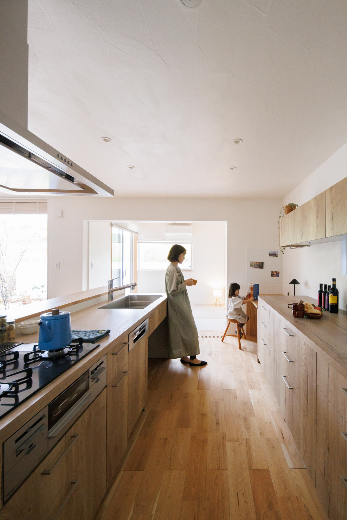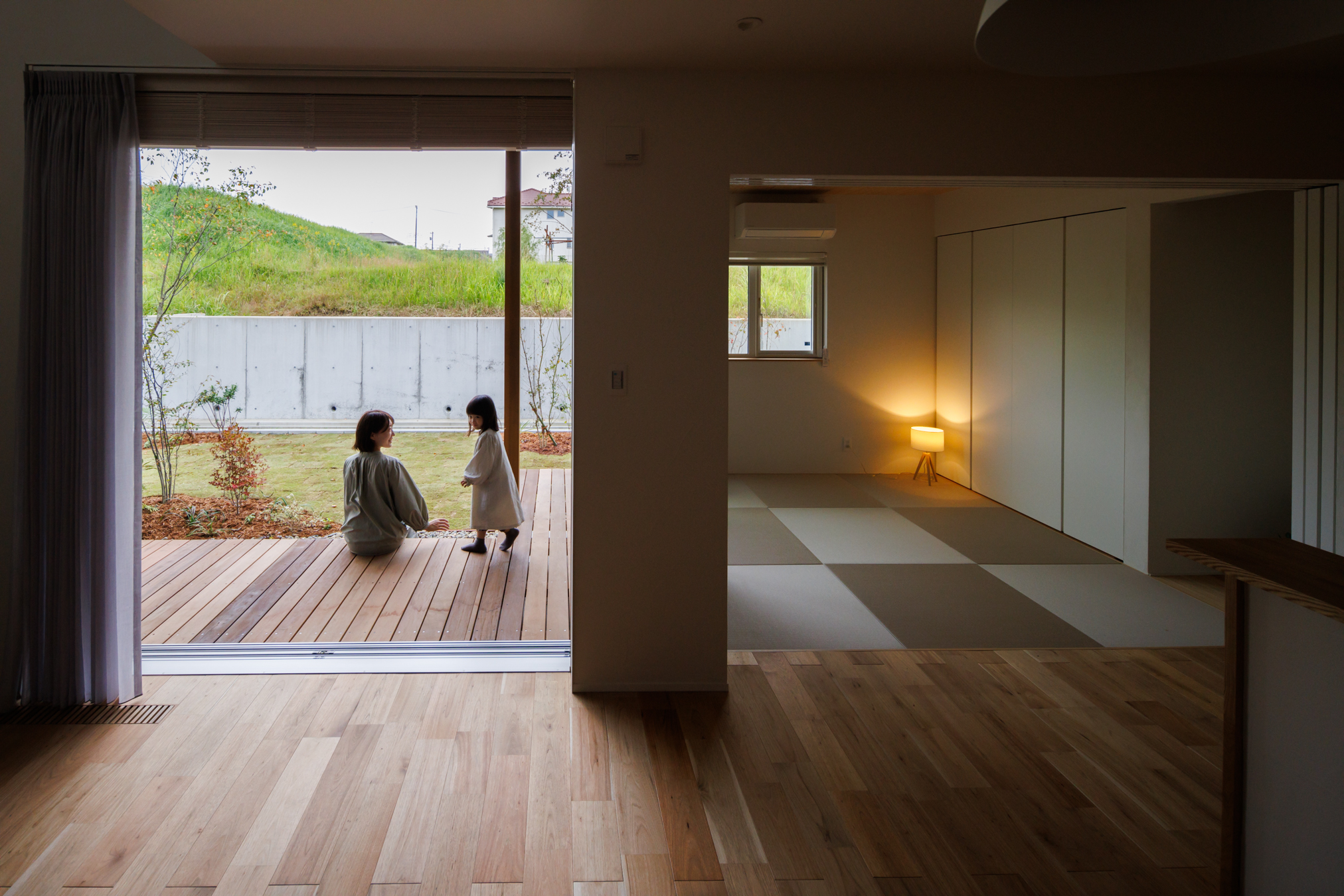 リビングの床と同じ高さで、サッシの敷居もバリアフリーなので、縁側がリビングの延長のようになっています。