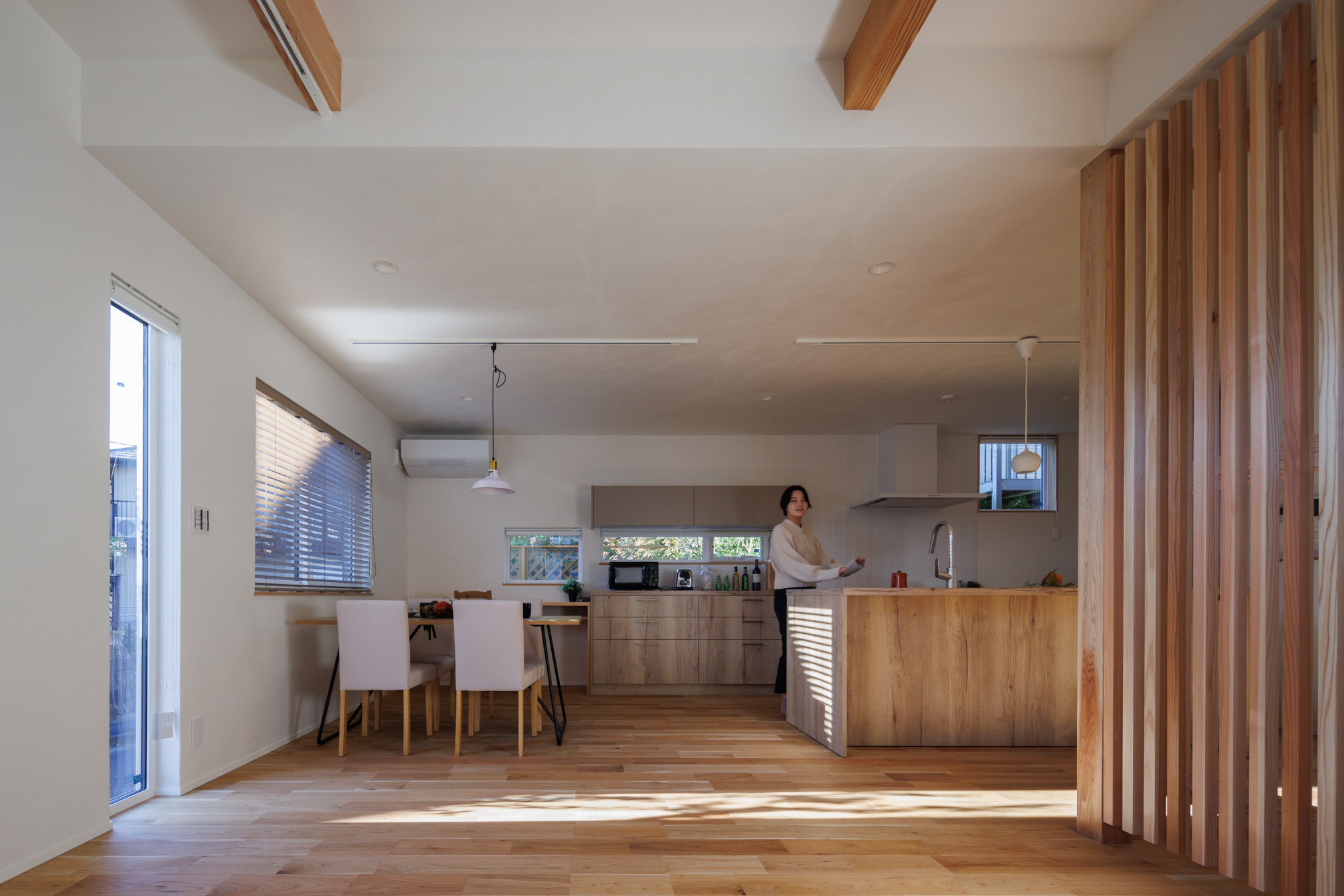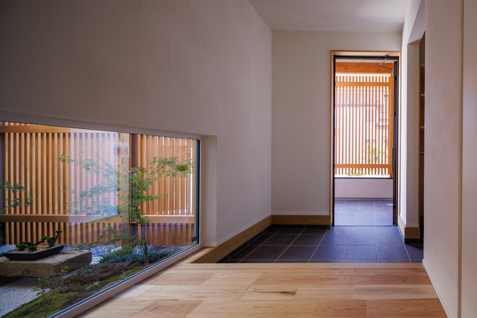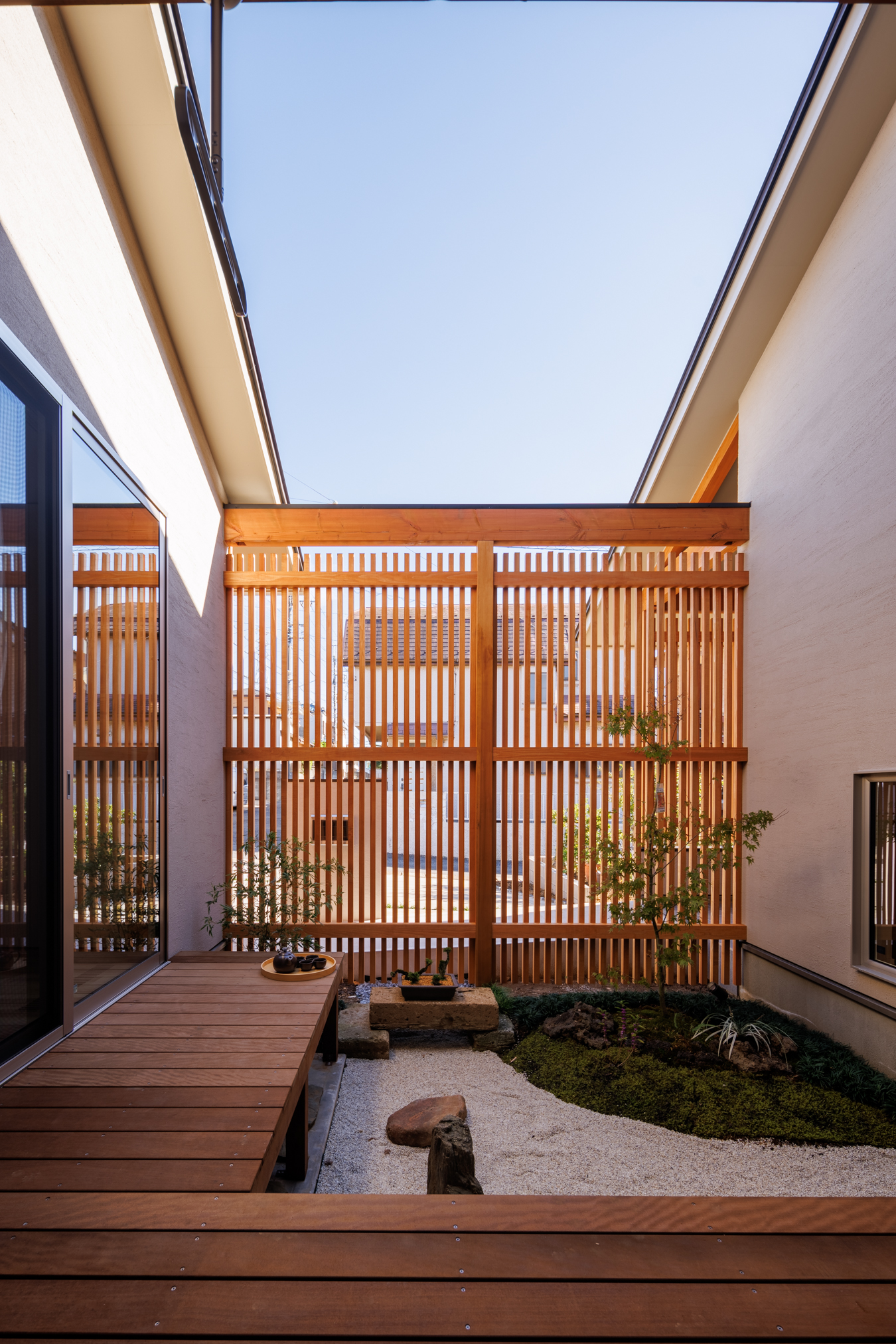 格子は、外と内を柔らかく分けてくれるので、中にいると圧迫感が和らぎますし、外からは中の様子はほとんど見えません。